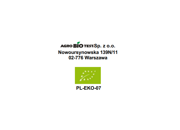 Produkt posiada Unijny Certyfikat Ekologiczny.