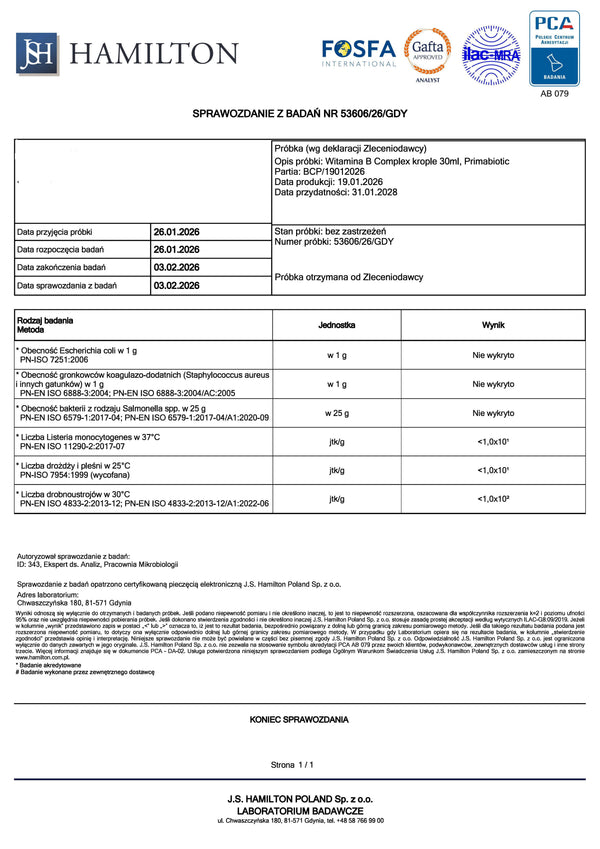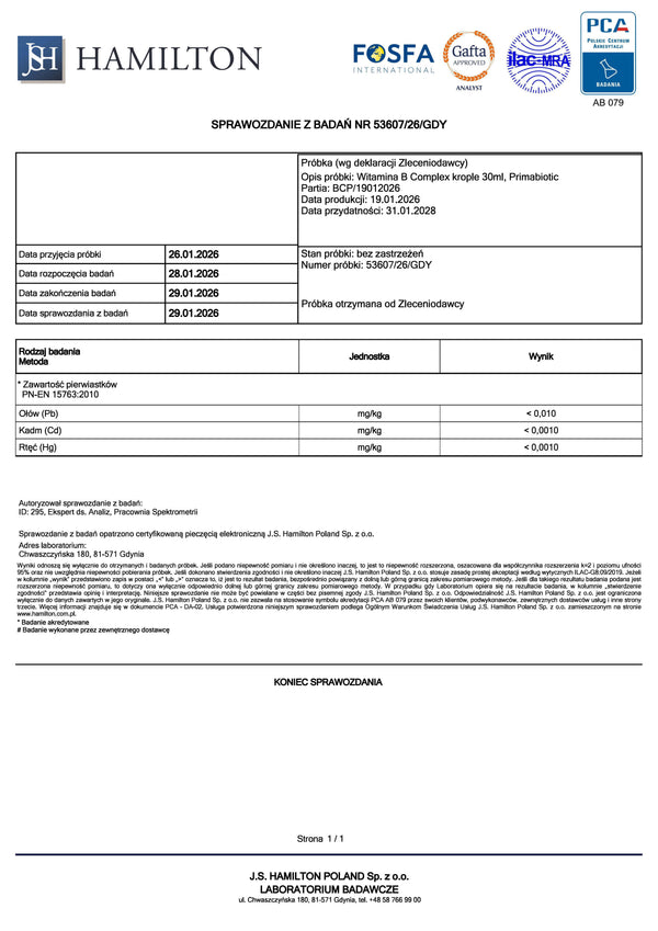 Witamina B Complex Primabiotic dostępna jest w formie wygodnych do przyjęcia kropli lub kapsułek.